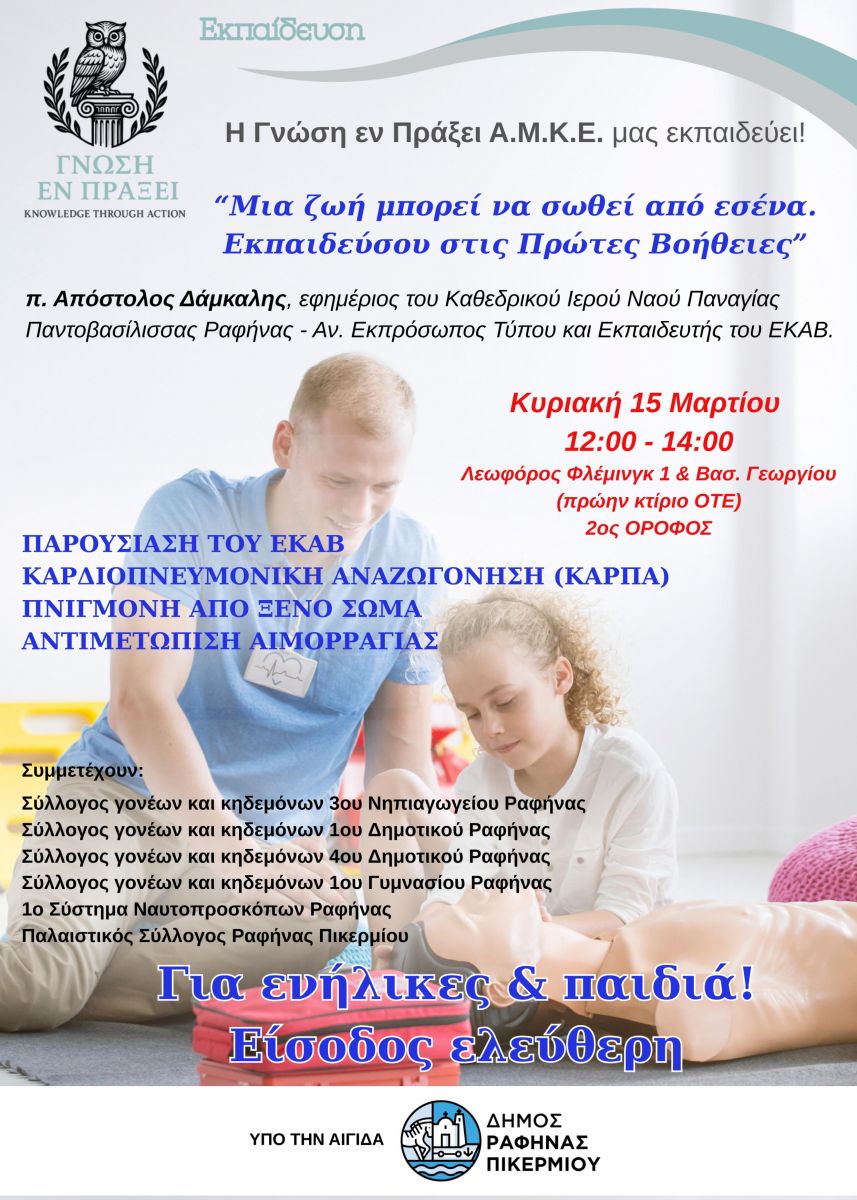 Η «Γνώση εν Πράξει» διοργανώνει σεμινάριο Πρώτων Βοηθειών στη Ραφήνα, την Κυριακή 15 Μαρτίου και ώρα 12:00, στον χώρο της Λεωφόρου Φλέμινγκ 1 & Βασ. Γεωργίου (πρώην κτίριο ΟΤΕ, 2ος όροφος).